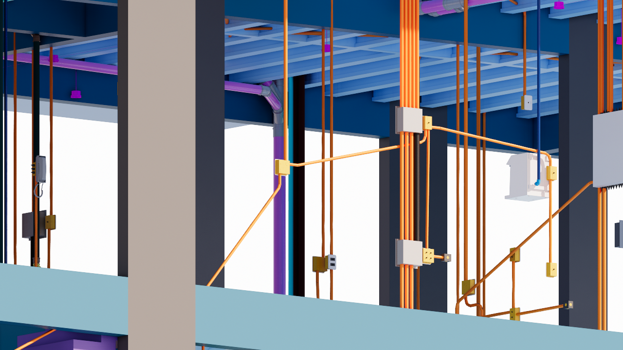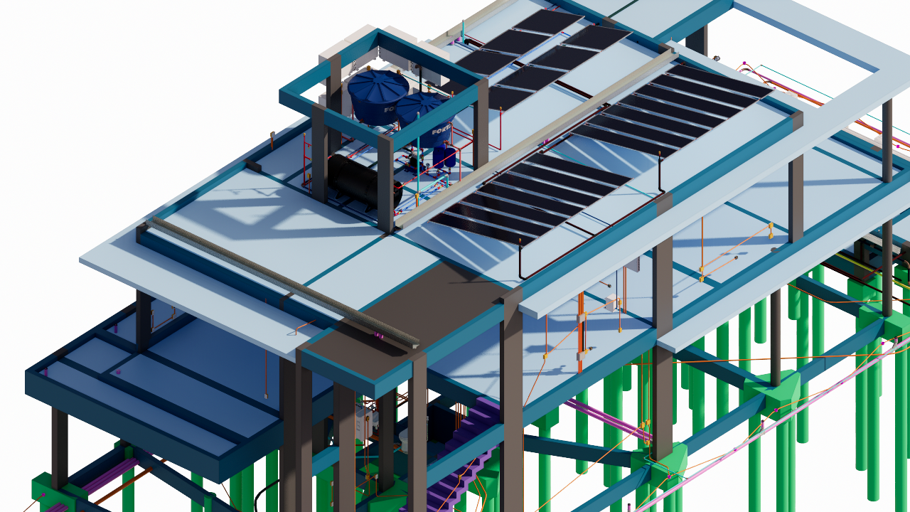 • Modelagem 3D de todas as disciplinas (Arquitetura, Estrutura, Elétrico, Comunicações, CFTV, Hidráulico, Sanitário, Pluvial);